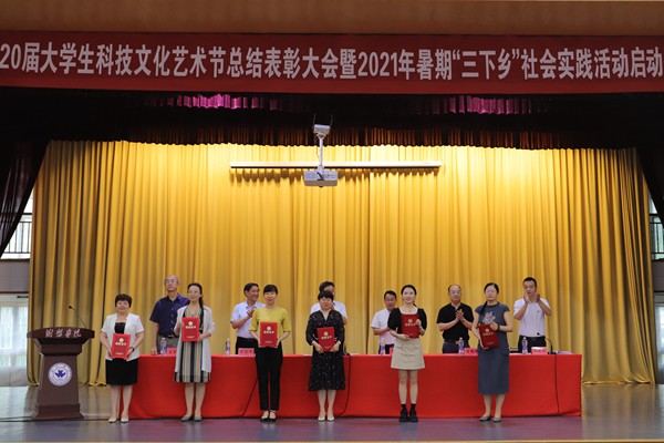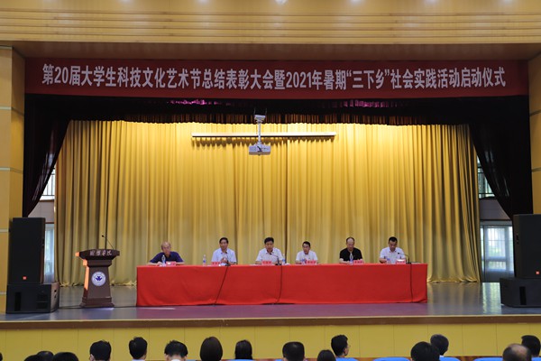 本网讯 6月28日,学校第20届大学生科技文化艺术节总结表彰大会暨2021年暑期“三下乡”社会实践活动启动仪式在闻韶楼报告厅举行。学校党委副书记王清明,学校党委委员、宣传部部长单振涛出席仪式,学生工作处、教师工作部、教务处负责同志参加。各二级学院分管学生工作负责人、团总支负责人、受表彰集体和个人代表、暑期“三下乡”社会实践服务队及志愿者代表参加本次活动。团委相关同志主持会议。