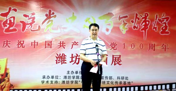 本网讯 6月29日,由潍坊学院宣传部、美术学院、科研处承办的“画说党史 百年辉煌——庆祝中国共产党建党100周年潍坊年画展”开幕式在潍坊学院美术馆举行。校长冯滨鲁出席开幕式,副校长赵光强在开幕式上致辞。