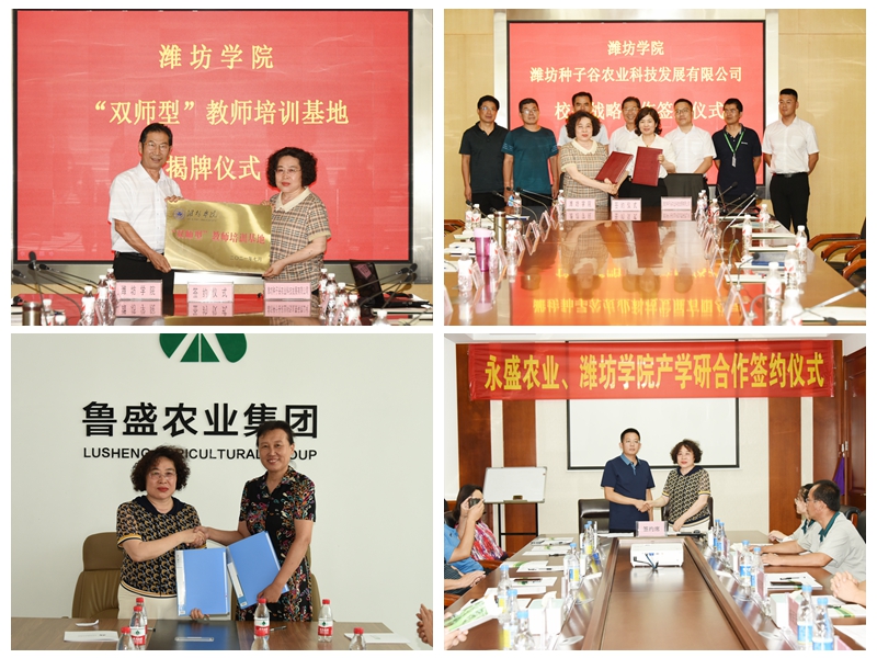 在寿光蔬菜大厦三楼多功能会议室,曹慧与潘子龙代表校企双方签署“双师”培训基地协议,并为基地揭牌。寿光蔬菜产业控股集团副总经理、潍坊种子谷农业科技发展有限公司董事长王月娟与曹慧签署校企战略合作协议。