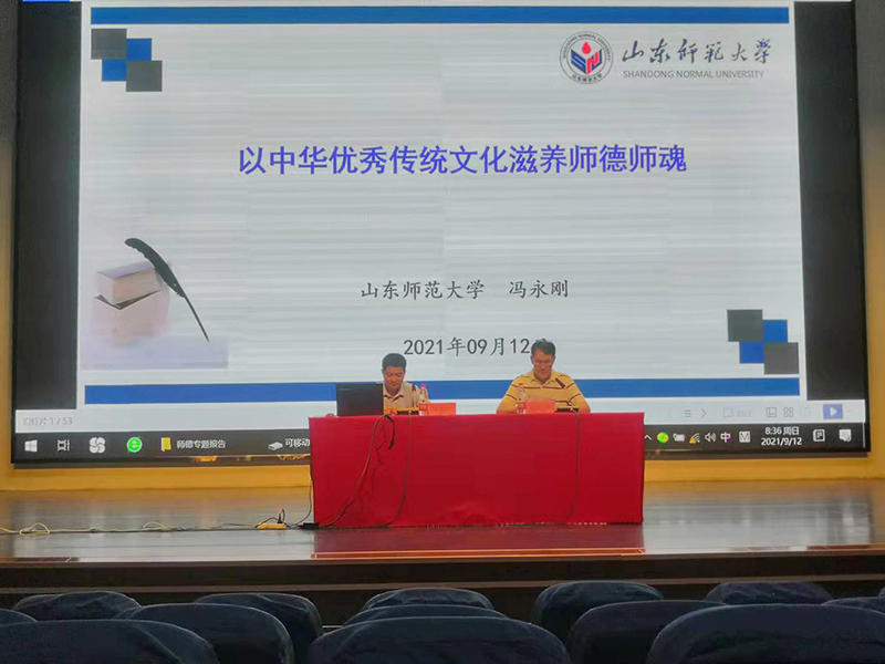 冯永刚教授以“中华优秀传统文化滋养师德师魂”为题,从传统文化和师德师魂的关系入手,详细阐述了以优秀传统文化滋养师德师魂的重大意义,着重解释了“何为文化”“何为中华优秀传统文化”“什么是师德”“什么是师魂”,并结合实际对“在优秀传统文化浸润中铸就师德师魂的路径”进行了深度解读。