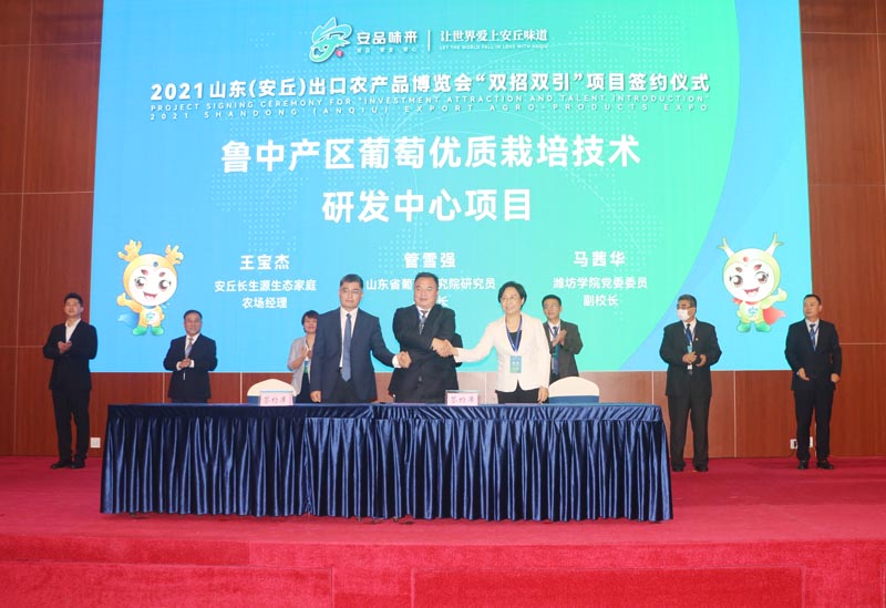 本网讯 9月27日,安丘市农产品进出口博览会“双招双引”签约仪式举行,作为十组签约项目之一,由山东省葡萄研究院、潍坊学院、安丘市长生源生态家庭农场三方共建的“鲁中产区葡萄优质栽培技术研发中心”完成签约。安丘市委副书记、市长贾勤清在仪式上致辞。副校长马茜华出席签约仪式并代表学校签约。