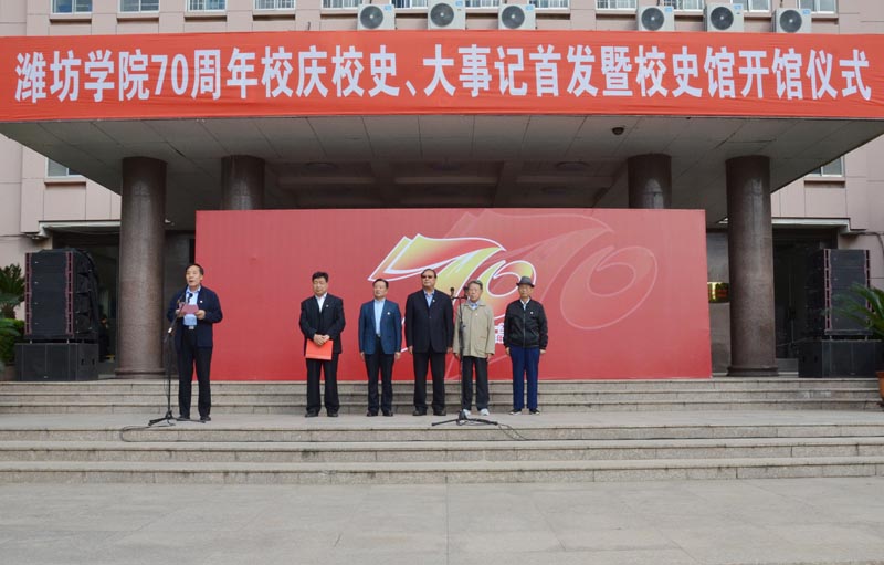 本网讯 10月14日,学校70周年校庆校史、大事记首发暨校史馆开馆仪式在启智广场举行。学校党委书记李东、校长冯滨鲁出席仪式并为校史馆揭牌。党委副书记王清明、原昌潍师专副校长张克云在仪式上致辞。副校长朱猷武主持仪式。原潍坊职业大学、潍坊广播电视大学副书记王伯祥,各单位、各部门主要负责人,校史编览组工作人员,学生代表参加仪式。