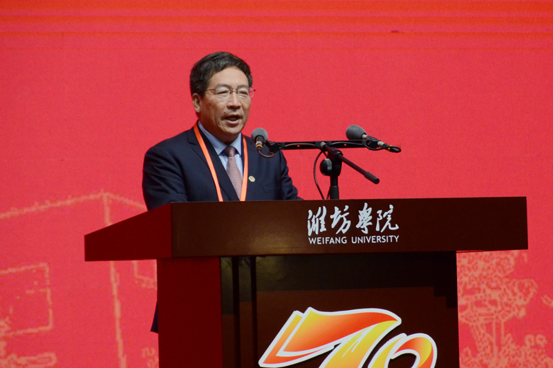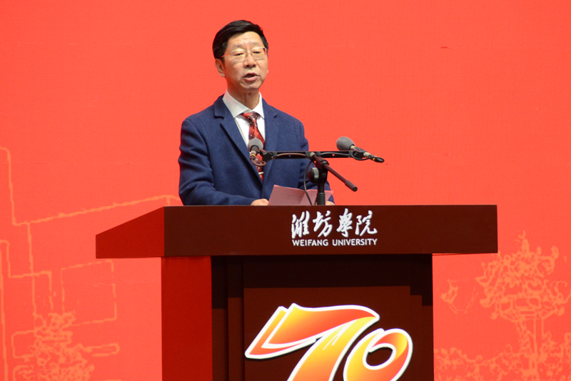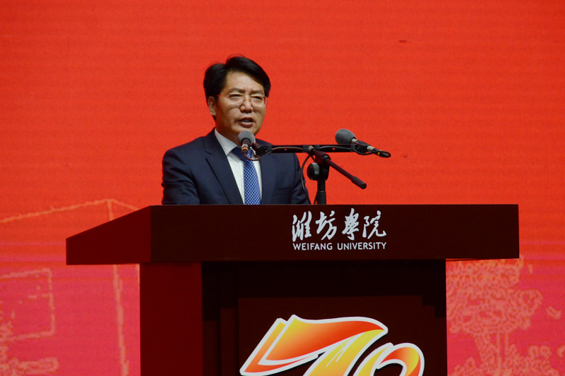 校长冯滨鲁在致辞中首先回顾和总结学校的奋斗历程与取得的成就。他说,70年来,学校始终坚持党的领导,全面加强党的建设,认真贯彻党的教育方针,坚持社会主义办学方向,聚焦“培养什么人、怎样培养人、为谁培养人”这个根本问题,牢牢把握人才培养根本点,注重激发和释放科技创新源动力,不懈打造人才师资真硬核,深耕服务社会主战场,不断提升文化传承创新软实力,努力拓展国际交流合作新舞台。他代表学校,向各级领导、兄弟单位同仁、社会各界人士表示衷心的感谢;向学校历任老领导、老前辈和天南海北潍院人致以崇高的敬意。展望学校美好的未来,冯滨鲁表示,我们将强化政治引领,走大学善治之路;聚力提质增效,走内涵发展之路;加快转型提升,走特色发展之路;全面深化改革,走创新发展之路;推进全面协同,走开放发展之路;坚持以人为本,走和谐发展之路。一代代潍院人为之接续奋斗的“潍院梦”就在前方,我们将坚持以习近平新时代中国特色社会主义思想为指导,以建校70周年为新的起点,坚定信心、鼓足干劲,锐意改革、砥砺前行,为加快建成优势特色突出的高水平应用型大学不懈奋斗,为推动山东高等教育事业和区域经济社会发展作出新的更大贡献。