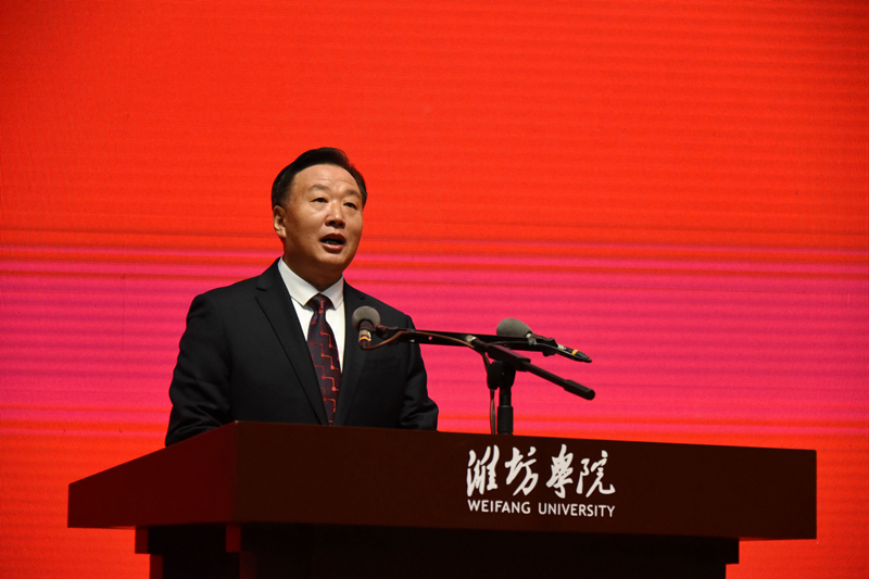 田庆盈代表中共潍坊市委、潍坊市人民政府和938.7万潍坊人民,向潍坊学院全体师生和广大校友表示热烈祝贺,向长期以来关心支持潍坊发展的各界人士表示衷心感谢。他说,潍坊学院秉承厚德、博学、求是、创新的校训,办学规模、培养质量、服务能力不断提升,逐步发展成为具有较强区域影响力的综合性本科高校。70年来,学校累计向社会输送了30多万专业人才,这些人才活跃在各个领域,各条战线,创造了优异的佳绩。建校以来,潍坊学院始终与潍坊发展同心同向、同频共振。尤其是进入新时代,主动聚焦全市发展大局,在产教融合、乡村振兴、人才培养等各方面改革创新、探索实践,为全市经济社会发展做出了重要贡献。当前,我国开启了全面建设社会主义现代化国家新征程,潍坊正朝着GDP过万亿、进军国内二线城市、冲刺全国大中城市综合实力30强的“123”发展目标迈进,加快建设人民满意的现代化品质城市。希望潍坊学院落实立德树人根本任务,自强不息,守正创新,进一步强化学科建设,优化人才培养体系,积极争取升建大学,加快实现潍坊人民的大学梦,努力为经济社会发展培养更多的优秀人才。学为人师,行为世范,希望老师们争做有理想信念、有道德情操,有扎实学养、有仁爱之心的好老师,积极为党育人,为国育才。未来属于青年,希望寄予青年,希望广大青年学子立大志、明大德,成大才、担大任,不负时代,不负韶华,努力成为堪当大任的时代新人。市委、市政府将一如既往地支持潍坊学院的建设和发展。