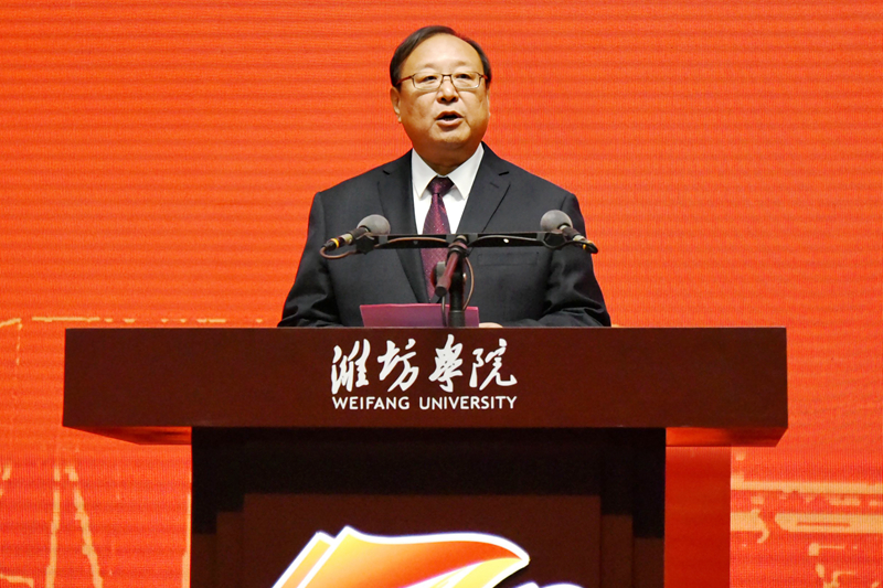 邓云锋在致辞中代表中共山东省委教育工委、山东省教育厅祝贺潍坊学院建校70周年。他指出,七十年的风雨兼程,也伴随着我国高等教育的改革与发展。潍坊学院坚持正确的办学方向,始终认真贯彻党的教育方针,办学规模不断扩大,办学条件持续改善,教育质量明显提高,综合实力稳步增强,为社会培养了35万各级各类人才,为推动山东省的经济社会发展作出了重要的贡献,赢得了社会的广泛赞誉。特别是党的十八大以来,潍坊学院紧紧围绕落实立德树人的根本任务,坚持走内涵式发展道路,聚焦工学、经济学、农学、教育学等学科专业建设,大力推进应用型大学转型发展,入选了我们山东省应用型本科高校建设首批支持单位和应用型人才培养特色名校立项建设单位,不断深化校企合作、协同育人,与潍柴集团、歌尔股份等知名企业合作建设现代产业学院,磁悬浮技术、银鲑鱼养殖、水果精准栽培、节能研究等科技成果成功转化,服务地方经济社会发展成果丰硕,在省内外的知名度和美誉度在不断提升。他希望潍坊学院始终坚持以习近平新时代中国特色社会主义思想为指导,深入学习贯彻习近平总书记关于教育的重要论述,坚守为党育人,为国育才的初心使命,以建校七十周年为一个新的起点,切实加强党对高校的全面领导,深入落实立德树人根本任务,在深化改革、服务需求、开放合作中实现高质量发展;主动对接国家和我省的重大战略,立足学校的办学定位和学科的发展规律,优化学科的专业结构,实现产学研的深度融合,提高教育教学的质量,打造一流的本科教育,努力培养更多担当民族复兴大任的时代新人。希望广大教师要认真落实习近平总书记的殷切嘱托,担当育人使命,厚植教育情怀,潜心教书育人,不断提升思想引领、人才培养、科学研究的能力水平,争做四有好老师;广大同学要秉承“厚德、博学、求是、创新”的校训,树立远大理想,传承红色基因,珍惜青春年华,勤奋学习,刻苦钻研,心怀爱国情,笃定报国志,付诸强国行。邓云锋表示,省委教育工委和省教育厅,将和潍坊市委、市政府一起来推动省市共建潍坊学院的工作,引导学校进一步聚焦潍坊重点产业发展需求,做好学科和专业的布局,做强优势特色,不断提升学校的办学水平和人才培养质量,加快高水平应用型大学的建设步伐。