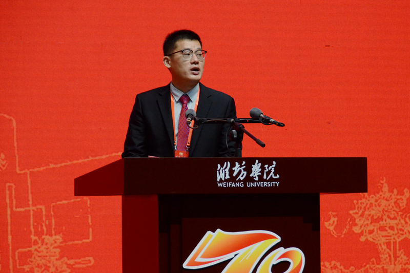 李东在主持大会时指出,潍坊学院建校70周年华诞是学校发展史上的一个重要里程碑,今天的潍坊学院,又站在了加快建设高水平应用型大学新的历史起点。我们将紧密团结在以习近平同志为核心的党中央周围,深入学习贯彻习近平总书记“七一”重要讲话精神,认真落实省委、省政府工作要求,不辜负各级领导、社会各界和广大校友的期望和厚爱,以70周年校庆为崭新起点,深入贯彻党的教育方针,认真履行大学使命责任,锐意进取、开拓创新,为加快建成优势特色突出的高水平应用型大学不懈奋斗。