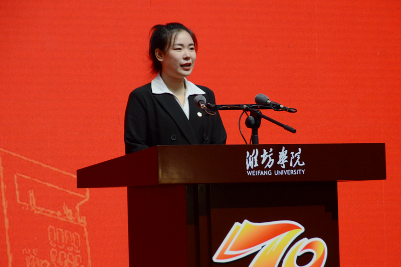 “我们生逢盛世,肩负重任,必将与时代同向同行!”文学与新闻传播学院2018级学生张淑琪代表在校生发言。她说,我们在最好的年纪来到了潍坊学院,不是空着手而来,而是带着青春的梦想,带着求知的热忱,带着报国的热血而来!我们要永葆家国情怀,传承弘扬“和衷共济、艰苦奋斗、追求卓越”的潍院精神,在这最好的时代书写熠熠生辉的篇章,在为民族、为人民、为人类的不懈奋斗中绽放绚丽之花。
