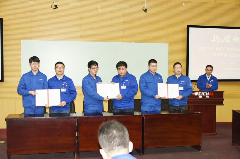 会上,丁子信、刘永胜为新聘产业导师颁发聘书。产业导师代表与学生代表签订导师带徒协议。会议还播放了2018级学生在潍柴集团理实一体阶段性学习总结视频。
