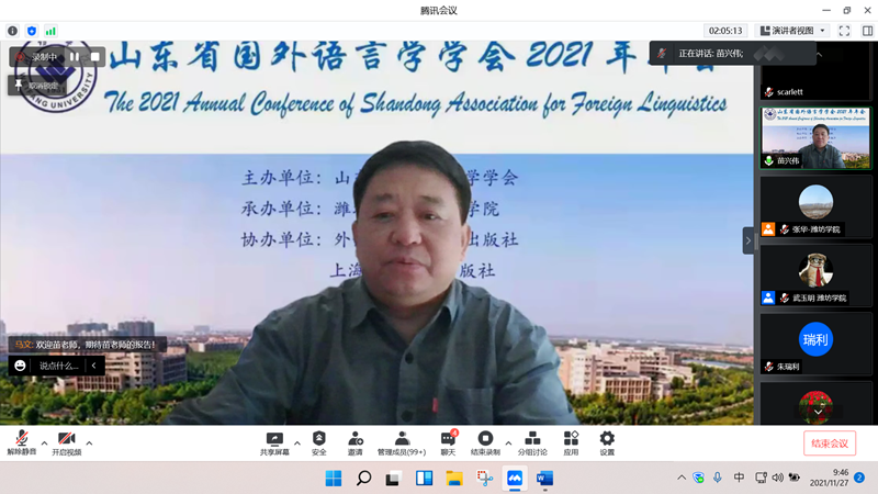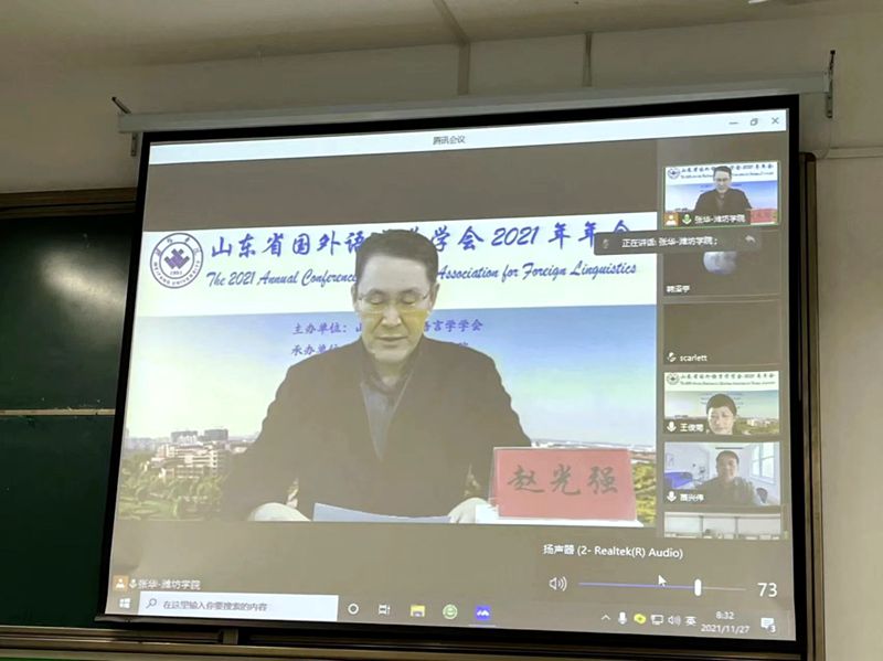 本网讯 11月27日至28日,山东省国外语言学学会2021年年会在我校举行。本届年会由山东省国外语言学会主办,潍坊学院外国语学院承办,来自省内外60多所高校的300余名代表参加了此次线上年会。副校长赵光强出席开幕式并致辞,山东省国外语言学学会会长王俊菊代表学会致辞,开幕式由外国语学院院长韩泽亭主持。