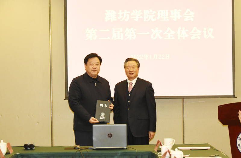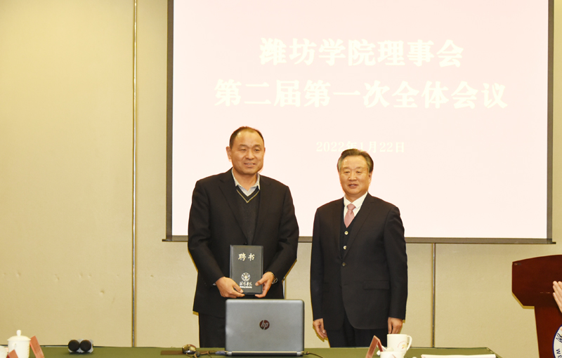 会议根据《潍坊学院章程》和《潍坊学院理事会章程》选举产生了新一届理事会成员。李东当选为理事长,冯滨鲁当选为常务副理事长,张华当选为秘书长。潍坊鑫源金店有限公司董事长曲金民,中国科学院院士刘以训,山东景芝酒业股份有限公司董事长刘全平,潍坊市委教育工委常务副书记、市教育局党组书记、局长杜全平,南开大学教授逄锦聚,歌尔声学股份有限公司董事长姜滨,潍坊昌大建设集团有限公司董事长徐鹏强,潍柴集团工会主席鲁文武当选为副理事长。原潍坊市政府顾问、潍坊学院原党委书记辛丕宏同志,潍坊理工学院党委书记、潍坊学院原党委书记孙文亮同志当选为名誉理事长。新当选的理事长李东为新当选的副理事长颁发了聘书。
