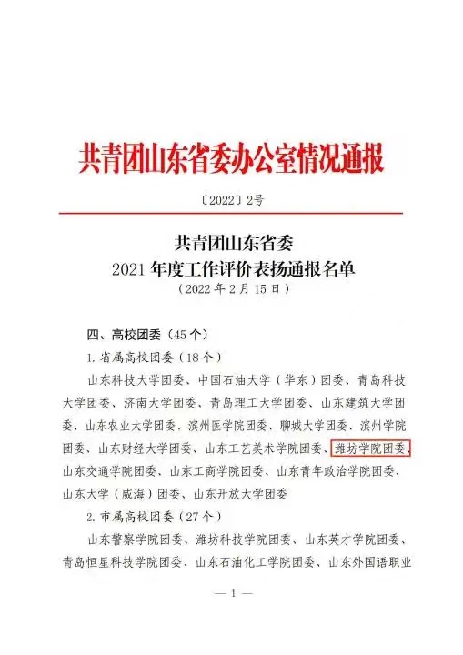本网讯 近日,团省委下发《共青团山东省委2021年度工作评价表扬通报名单》(〔2022〕2号),校团委在全省共青团工作考核中获评“优秀”等次。