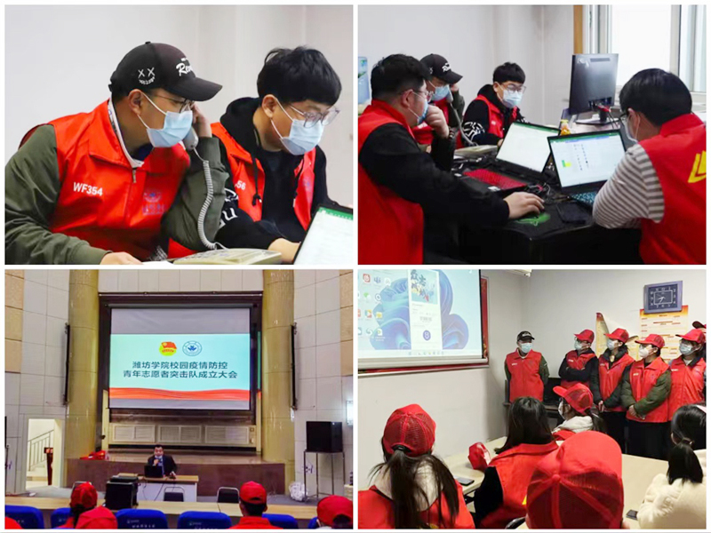 校团委第一时间发布《致全校各级团组织和广大团员青年的倡议书》,号召全校各级团组织和广大团员青年,服从命令、听从指挥、争做表率、共抗疫情。12日下午,校学生会学生骨干率先到岗,协助学校疫情防控专班核查风险地区学生在校信息,逐个电话排查登记学生信息,为学校疫情防护筑牢基础安全保障。为做好人员密集场所和核酸检测现场教育引导,根据学校疫情防控工作安排,校团委制定《疫情防控青年志愿服务工作方案》,成立工作专班和青年志愿者突击队,做好协调调度、教育宣传和服务保障。在青年志愿者突击队成立大会上,学校团委倡议青年志愿者时刻牢记 “我们就是一面旗帜”,带头强化防疫意识,带头做好防护;遵守防疫安排,坚决听从指挥;挺起青春担当,科学参与防控,充分展现潍院青年的责任与担当,不负热血,不负青春。