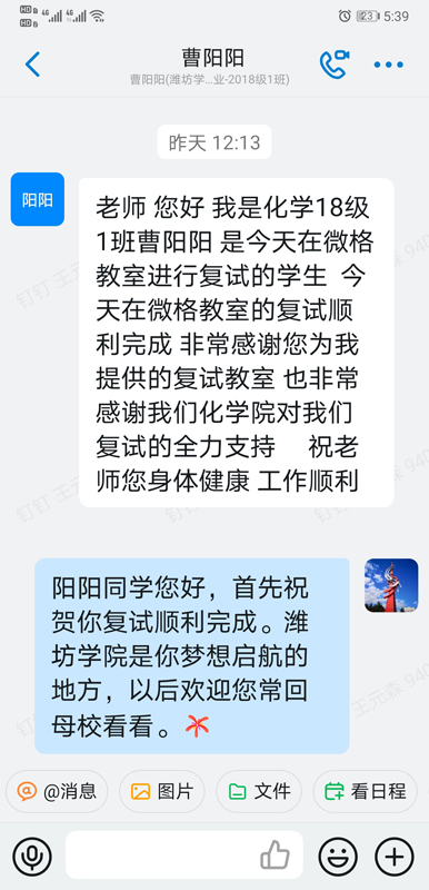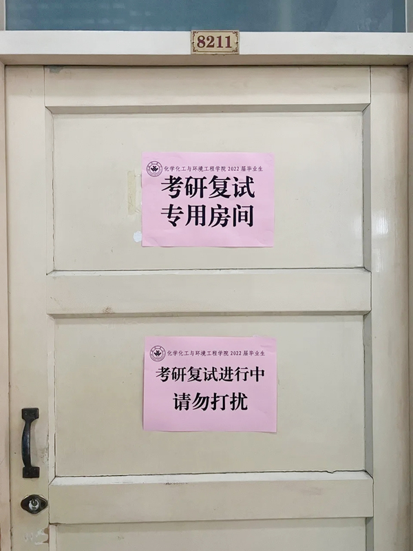 “由于疫情原因,无法出校,没有合适场所参加复试,我将困难反映给老师后,学院专门给我腾出一间办公室来让我及时参加复试,我深受感动。我即将毕业离开潍坊学院,在化院的点点滴滴,还有化院各位领导老师的帮助,我将永远铭记于心。”刚参加完广西大学线上复试的应用化学专业毕业生卓家添激动地说。