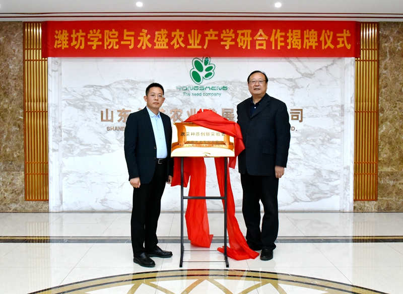本网讯 为深入推进产学研合作,加强产教融合,打造校企合作新样板,5月10日,潍坊学院与永盛农业产学研合作签约揭牌仪式在山东永盛农业发展有限公司举行。校长冯滨鲁与山东永盛农业发展有限公司董事长、永盛(寿光)蔬菜技术研究院院长梁增文为“潍坊学院现代园艺研究院”“设施蔬菜绿色技术山东省工程研究中心”揭牌。学校办公室、种子与设施农业工程学院相关负责同志、永盛农业相关人员参加活动。仪式由种子与设施农业工程学院院长曹慧主持。