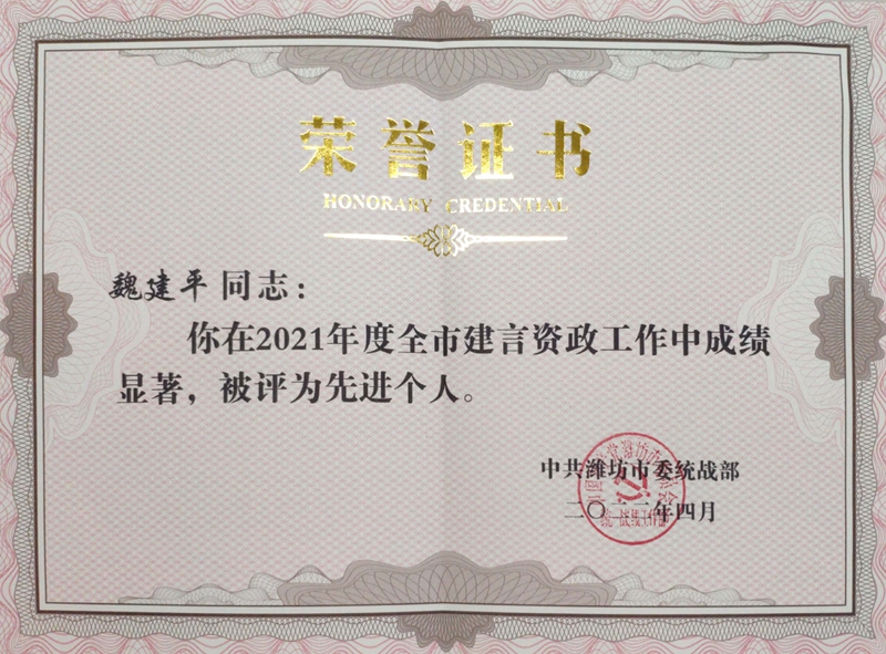本网讯 2022年4月,潍坊市委统战部表彰了2021年度全市统战信息宣传工作先进单位和先进个人。我校经济管理学院魏建平教授被评为全市建言资政工作先进个人,这是他连续三年获得此项殊荣。
