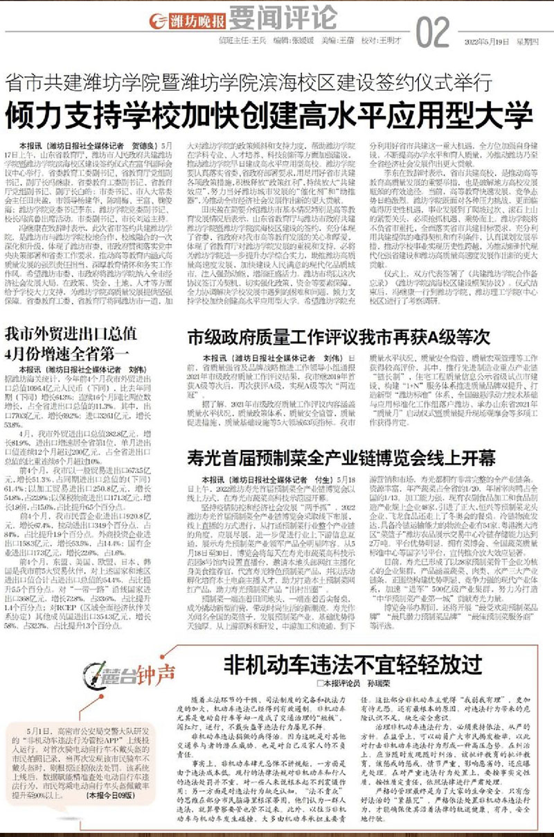 【潍坊晚报】倾力支持加快创建高水平应用型大学 省市签约共建潍坊学院