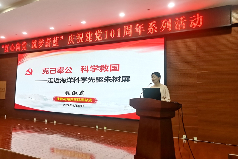 签约仪式上,潍坊市海洋发展和渔业局部分干部职工、生物与海洋学院师生代表共同聆听了生物与海洋学院教师党支部书记张淑芝副教授所作的题为《克己奉公,科学救国——走近海洋科学先驱朱树屏》的微党课。
