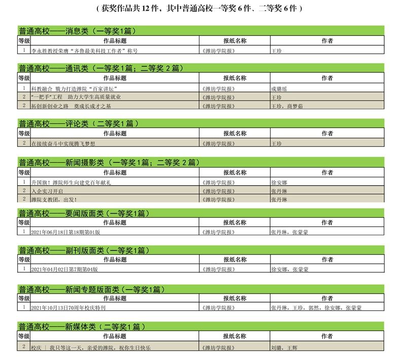 本次评选中,作品《李永胜教授荣膺“齐鲁最美科技工作者”称号》(作者王珍)获消息类一等奖;作品《科教融合 勠力打造潍院“百家讲坛”》(作者成璐瑶)获通讯类一等奖;作品《升国旗!潍院师生向建党百年献礼》(作者徐安娜)获新闻摄影类一等奖; 版面类作品2021年第18期第01版、2021年第7期第04版、2021年70周年校庆特刊分获要闻版面类、副刊版面类、新闻专题版面类一等奖;作品《“一把手”工程 助力大学生高质量就业》(作者王珍)《拓创新创业之路 奠成长成才之基》 (作者王珍、商梦茹)获通讯类二等奖;作品《在接续奋斗中实现腾飞梦想》(作者王珍)获评论类二等奖;作品《入企实习开启》《潍院支教团,出发!》(作者张丹琳)获摄影类二等奖;官微作品《校庆 | 我只等这一天,亲爱的潍院,祝你生日快乐》获新媒体类二等奖。