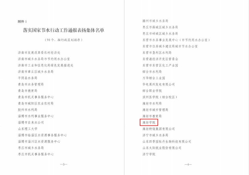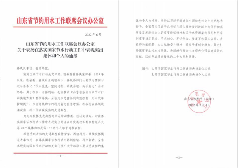 本网讯 近日,我校在落实国家节水行动工作中表现突出,受山东省水利厅通报表扬。国家节水行动是党中央、国务院重要决策部署,2019年以来,我校在省委、省政府正确领导下,认真贯彻习近平总书记“节水优先、空间均衡、两手发力”治水思路,勇于担当,开拓创新,扎实推动《山东省落实国家节水行动实施方案》贯彻落实,用水量得到有效控制,用水效率持续提升,水资源集约节约利用能力显著增强,在同行业中发挥了模范表率作用。