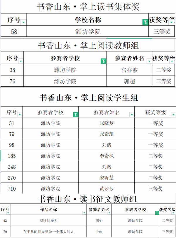 本网讯 由山东省委宣传部指导,山东省教育厅主办,山东省语言文字工作委员会办公室、山东教育电视台联合承办的山东省高校师生“奋进新征程 建功新时代”阅读活动,近日陆续公布获奖名单。本次活动共分为“书香山东·掌上读书”“书香山东·读书征文”“书香山东·朗读经典”三个子项目,依据“阅读闯关”“知识在线答题”“征文评选”等阶段成绩综合评定,共确定集体奖58个,我校荣获“书香山东·掌上读书”集体奖三等奖。在个人奖中,我校师生也收获颇丰:“书香山东·掌上阅读”教师组获二等奖1项、三等奖1项,学生组获一等奖3项、二等奖3项、三等奖1项;“书香山东·读书征文”教师组获二等奖1项、三等奖1项,学生组获一等奖2项,三等奖3项,李冬燕、王爱红被认定为“优秀指导教师”;“书香山东·朗读经典”学生组获一等奖2项、二等奖1项、三等奖2项,徐金德、吴瑜、陈思雨、石正涛被认定为“优秀指导教师”。