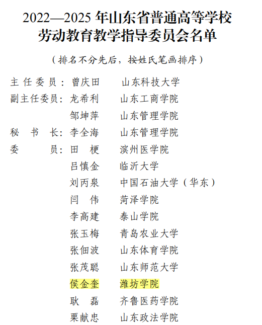 本网讯 近日,山东省教育厅下发关于成立2022-2025年山东省普通高等学校劳动教育教学指导委员会(以下简称“劳动教指委”)的通知,我校教务处处长侯金奎教授入选山东省劳动教指委委员。