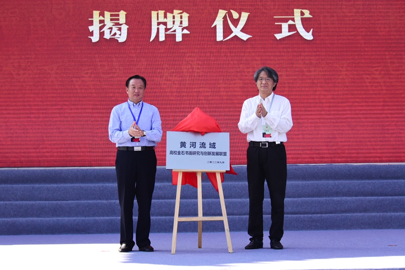 25日上午,在潍坊市人民政府主办的第四届陈介祺艺术节上,中国书法家协会分党组副书记、秘书长郑晓华与李东共同为黄河流域高校金石书画研究与创新发展联盟揭牌。