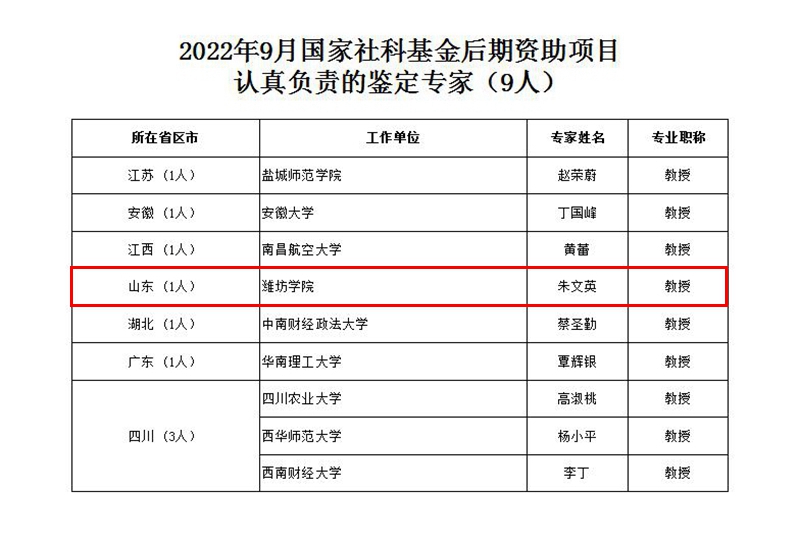 本网讯 近日,全国哲学社会科学工作办公室公布了2022年9月国家社科基金后期资助项目认真负责的鉴定专家名单,我校朱文英教授名列其中,为该项目山东省入选的唯一专家。