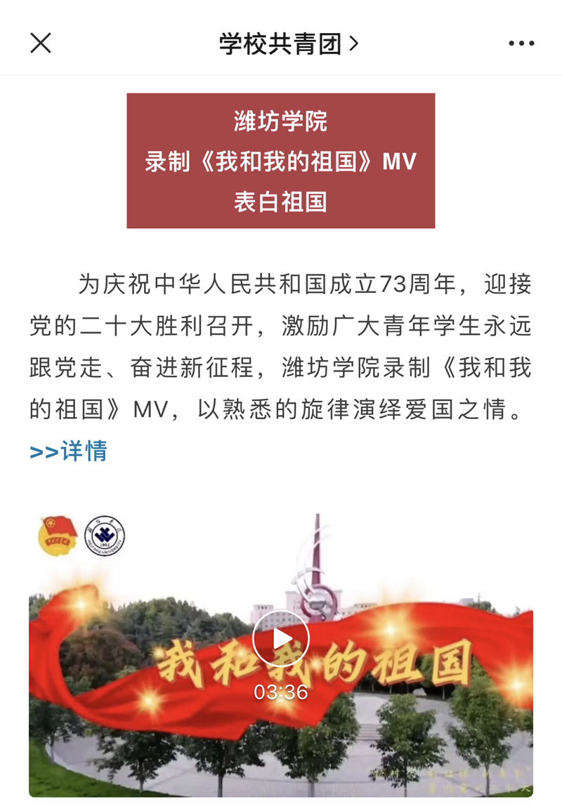 目前,《我和我的祖国》MV连续两天在团中央官方公众号《今天,这些高校亮了!》《升国旗,奏国歌!青春告白祖国,你的学校怎么做?》展示,与清华大学、浙江大学、华侨大学等高校同篇报道,总阅读量近10万,有效传播了潍院青年昂扬向上的精神风貌。