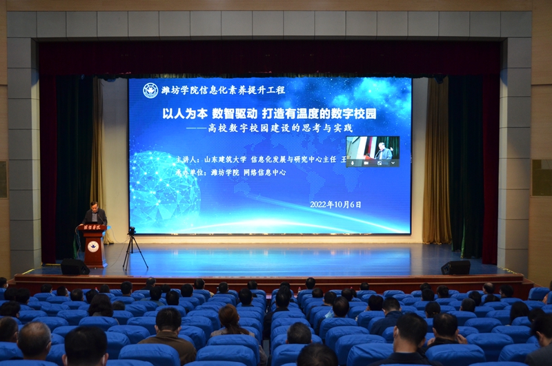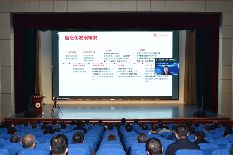 本网讯 为深入贯彻习近平总书记关于网络安全与信息化工作的重要论述,全面落实上级有关工作要求,加快推进我校信息化建设,10月6日,学校在图书馆报告厅举办信息化素养提升工程报告会,邀请山东建筑大学信息化发展与研究中心主任王兆文,通过线上方式作了题为《以人为本,数智驱动,打造有温度的数字校园---高校数字化校园建设思考与实践》的报告。学校党委书记李东,党委副书记、校长冯滨鲁,党委委员王建新、李连成、单振涛听取了报告。党委委员、副校长朱猷武主持会议。