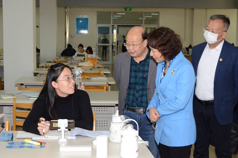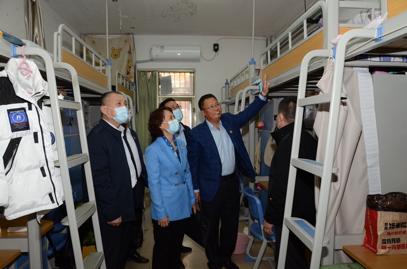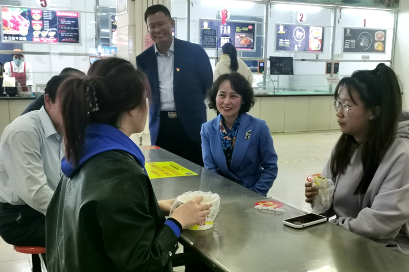 徐梅一行实地查看了安顺校区实验实训楼、校区警务室、室外核酸检测点、餐厅、学生公寓、校区临时留观区和图书中心等场所,每到一处徐梅都详细询问情况。在餐厅和公寓,徐梅和学生亲切交谈,了解学生的学习生活情况,勉励他们好好学习、立志成才。