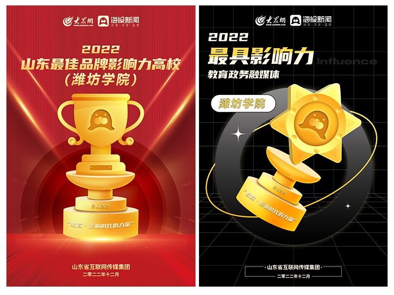本网讯 12月16日,由山东省互联网传媒集团大众网·海报新闻发起的“教育·影响时代的力量”年度评选结果出炉,潍坊学院荣获“2022山东最佳品牌影响力高校”和“2022山东最具影响力教育政务融媒体”两项荣誉,其中,在2022山东最佳品牌影响力高校”排名中,学校位列本科院校榜第二名。