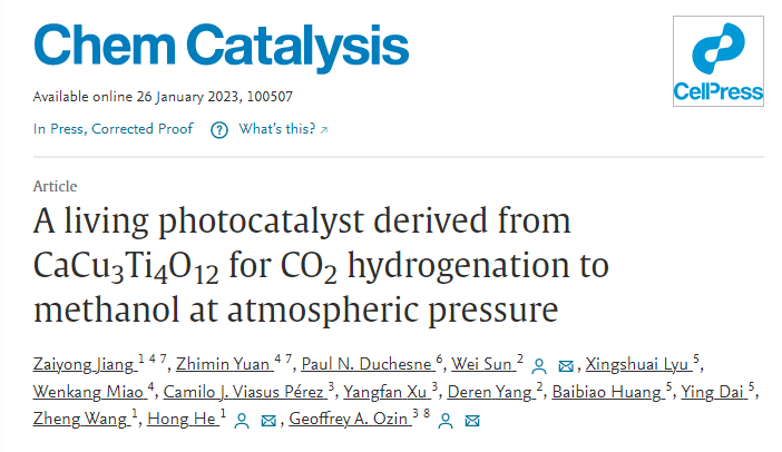 本网讯 近日,我校化学化工与环境工程学院姜在勇教授以第一作者在Cell Press细胞出版社期刊Chem Catalysis发表了题为“A living photocatalyst derived from CaCu3Ti4O12 for CO2 hydrogenation to methanol at atmospheric pressure”的研究成果,该论文上线第一天,就被《自然》(Nature)期刊Research highlights专题介绍和评述,引起了科研工作者的广泛关注。