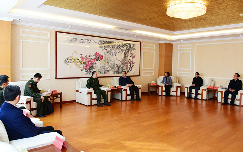 本网讯 2月16日,潍坊军分区大校政治委员于宝东一行三人来校考察交流。校党委副书记、校长冯滨鲁,党委副书记徐梅会见客人并进行座谈。