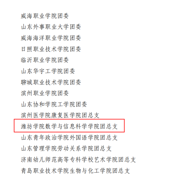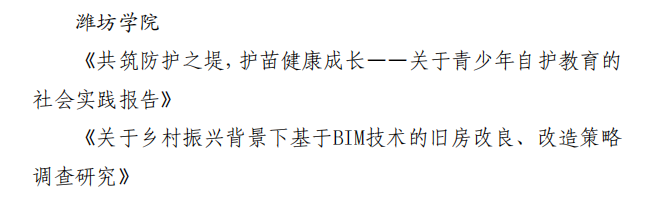 其中,数学与信息科学学院团总支荣获2022年山东省“三下乡”社会实践优秀组织单位;付璐等16名教师荣获2022年山东省“三下乡”社会实践优秀指导教师;陈倩等32名学生荣获2022年山东省“三下乡”社会实践优秀学生;化学化工与环境工程学院晨曦志愿者服务队等8支队伍荣获2022年山东省“三下乡”社会实践优秀服务团队;《共筑防护之堤,护苗健康成长——关于青少年自护教育的社会实践报告》等2篇调研报告荣获2022年山东省“三下乡”社会实践优秀调研报告。