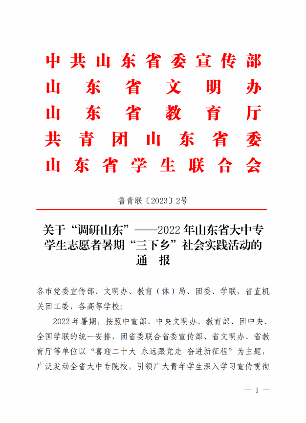 本网讯 日前,省委宣传部、省文明办、省教育厅、团省委、省学联公布了《关于“调研山东”——2022年山东省大中专学生志愿者暑期“三下乡”社会实践活动的通报(鲁青联〔2023〕2号)》,我校喜获59项集体和个人表彰荣誉。