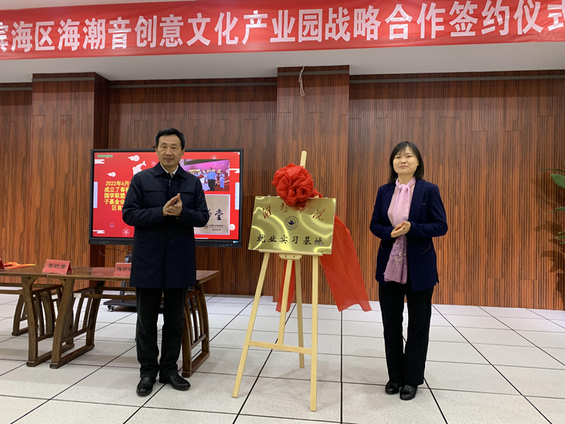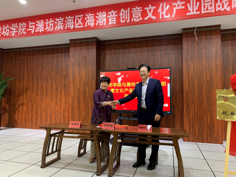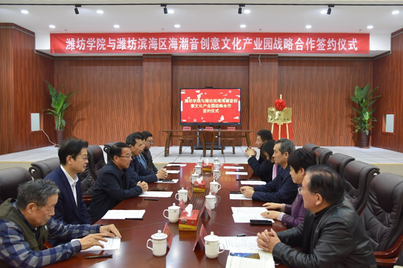 海潮音创意文化产业园董事长杨春杰对单振涛一行表示热烈欢迎,她详细介绍了公司的现状及未来发展前景,表达了与学校进一步推进校企合作的愿望。潍坊市滨海经济技术开发区管委会一级专员李树森对校企合作提出了要求,表达了祝愿,期待双方优势互补把合作共赢推向新的高度。滨海经济技术开发区旅游度假区(文体旅游产业发展中心)党委书记冯月玲介绍了海潮音为区域文化发展所作出的贡献,肯定了校企合作在提升人才培养质量、促进毕业生就业方面所起的作用。