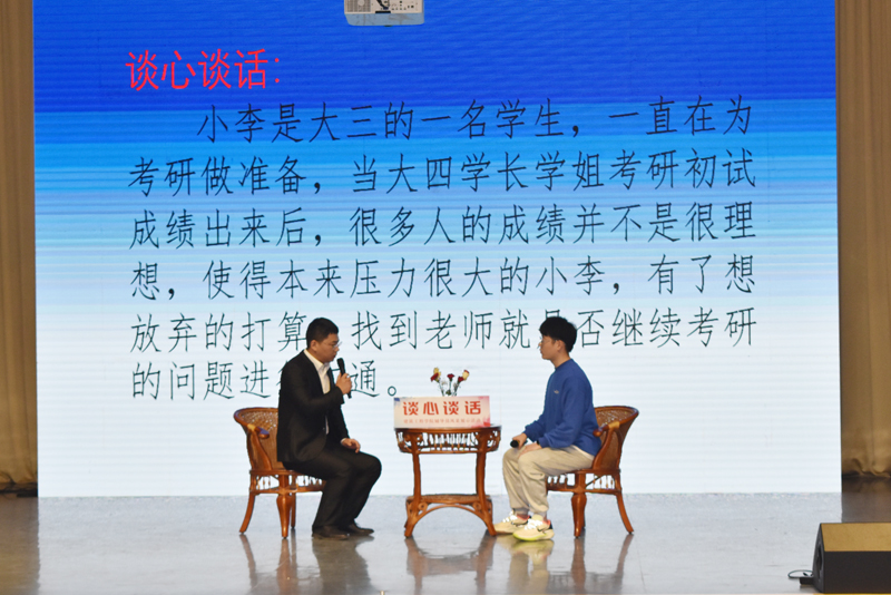 本次辅导员风采展示分为谈心谈话和主题班会两个环节。在谈心谈话环节,5位专兼职辅导员围绕辅导员九大职责,结合辅导员日常工作,采用贴合学生学习与生活的案例,从学生思想理论教育和价值引领、学生日常事务管理、大学生心理健康教育、职业规划与就业创业指导等方面还原学生学习、成长中遇到的问题。面对一个个难题,演职人员倾情演出,演绎角色到位;辅导员们沉着应对,以良好的精神面貌、过硬的心理素质以及充足的知识储备,找到问题本质,并结合工作实践经验,还原真实谈话过程,给出合理的解决方式和建议,开出一剂又一剂“良方”。