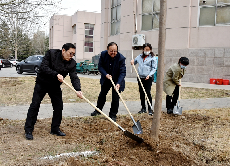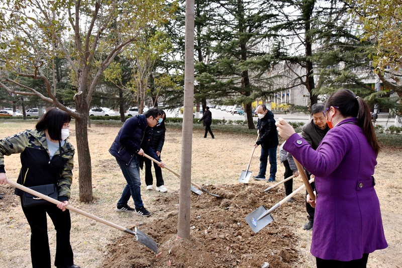 植树活动现场,在校领导的带领下,党员们热情高涨,积极劳作,挥锹填土、拎桶浇水。经过大家的辛勤劳动,一棵棵树苗“安家落户”,迎风挺立,吐露春意,为学校增添了一抹生机。