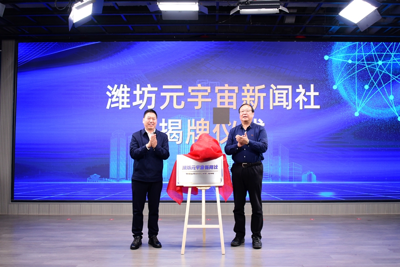 本网讯 5月12日,学校党委副书记、校长冯滨鲁参加潍坊元宇宙新闻社揭牌仪式,与潍坊日报社党委书记、社长张仁科共同为潍坊元宇宙新闻社揭牌。