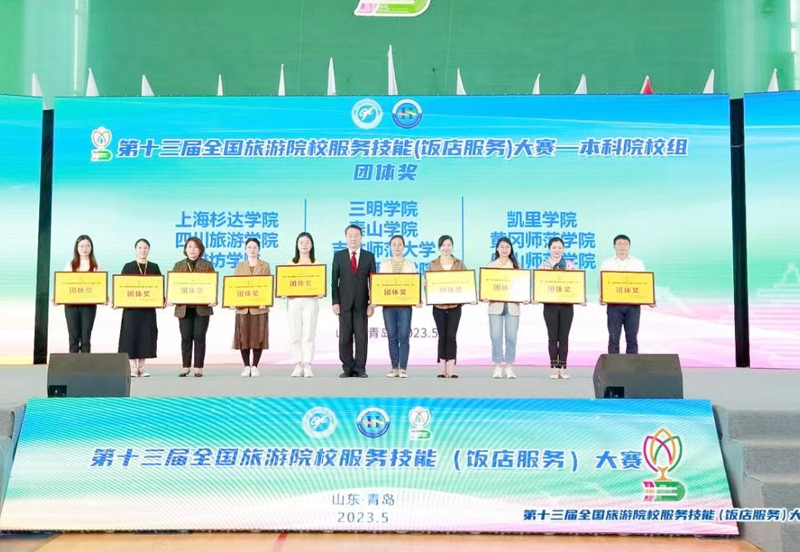 经过三天紧张激烈的角逐,我校4名选手斩获4个一等奖,我校成为本科院校组获奖数量最多的学校,取得历史性突破。孙腾宇同学获本科院校组中式铺床及开夜床赛项的一等奖第二名,李贝宁同学获本科院校组中餐宴会摆台赛项的一等奖第三名,孙朔和乔婷分别获本科院校组西餐宴会摆台赛项和鸡尾酒调制赛项的一等奖并列第八名。旅游管理专业代表队荣获最佳团体奖。