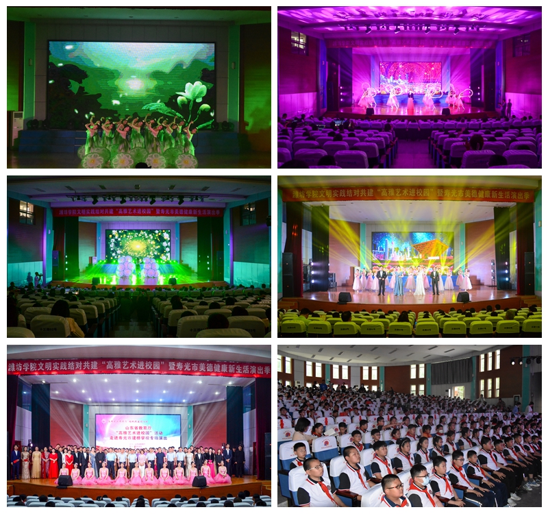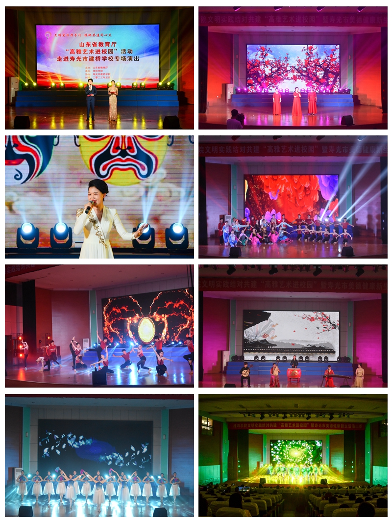我校党委副书记徐梅,党委委员、宣传部部长单振涛出席活动,寿光市委宣传部、寿光市教体局,我校音乐学院、党委宣传部相关同志参加活动,建桥学校师生近500人观看了演出活动。