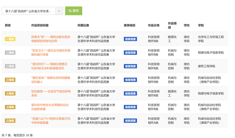 本网讯 5月18日至22日,第十八届“挑战杯”山东省大学生课外学术科技作品竞赛在齐鲁工业大学(山东省科学院)长清校区举行。我校斩获一等奖1项、二等奖2项、三等奖4项,实现获奖数量新突破!