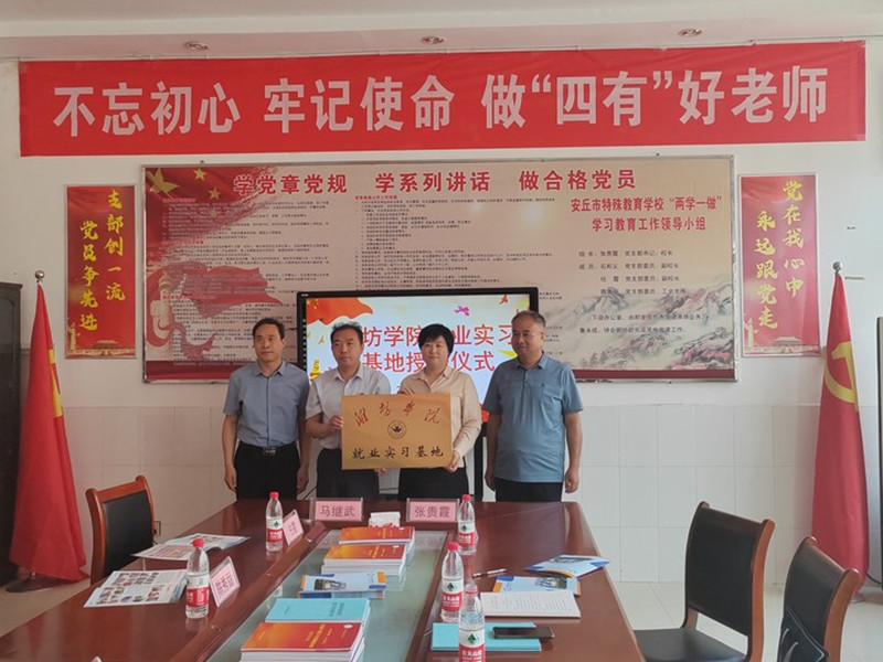 本网讯 5月24日,教师教育学院(特殊幼教师范学院)党总支书记马继武等一行5人到安丘市特殊教育学校举行就业实习基地签约及授牌仪式。安丘市教育工委副书记刘金平、安丘市特殊教育学校校长张贵霞出席。