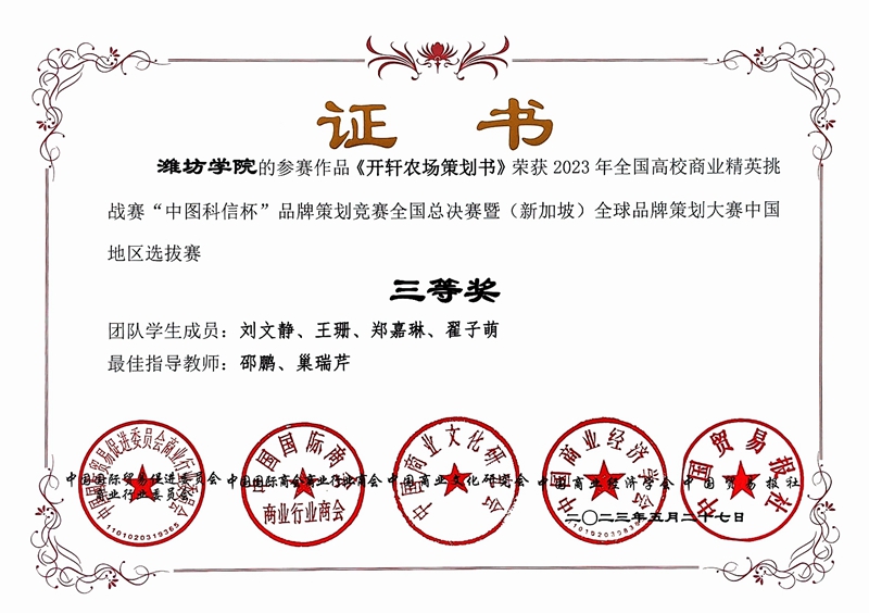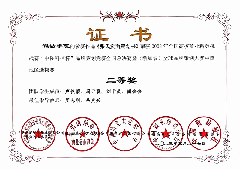 全国高校商业精英挑战赛品牌策划竞赛是“全国普通高校大学生竞赛排行榜”赛事,由全球华人营销联盟、中国国际贸易促进委员会商业行业委员会、中国国际商会商业行业商会、中国商业文化研究会、中国商业经济学会主办。本届竞赛共有来自全国各地的31个省、自治区、直辖市及特别行政区的500余所高等院校的3000余支参赛队报名参赛。竞赛要求参赛团队必须以真实中小企业产品或服务为策划对象,取得企业的书面授权,为企业目前的品牌建设提供切实的策划方案。通过此次竞赛,不仅提升了同学们对企业品牌策划所需综合能力的认知,锻炼了同学们的团队协作和撰写策划方案的能力,提高了同学们分析和解决实际商业问题的能力,也展示了我校近年来全面贯彻“以赛促教、以赛促学、教赛相长”的指导方针,不断加强专业建设与实践教学改革的丰硕成果。