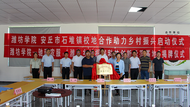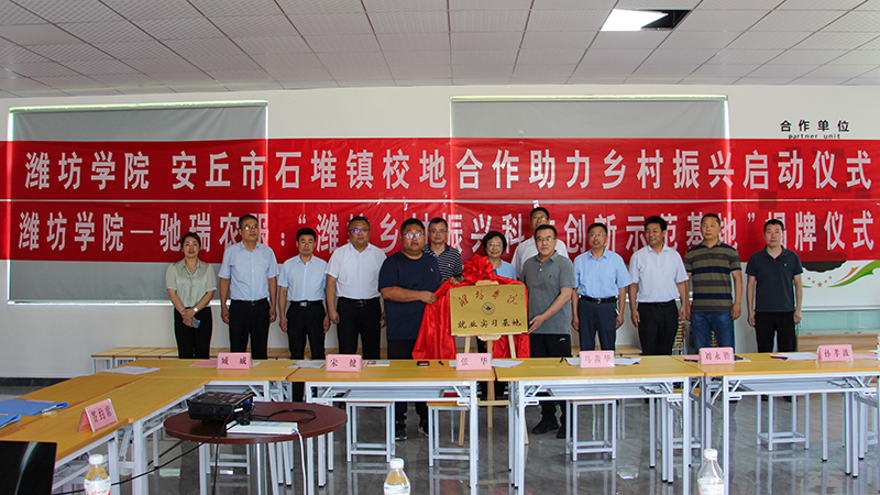马茜华与山东驰瑞农业服务有限公司总经理李清华共同为“潍坊乡村振兴科技创新示范基地”揭牌,合作发展处负责同志与石堆镇党委副书记、镇长赵锦华签署乡村振兴创新发展校地合作协议,机械与自动化学院负责同志为山东驰瑞农业服务有限公司颁授“潍坊学院就业实习基地”牌匾。