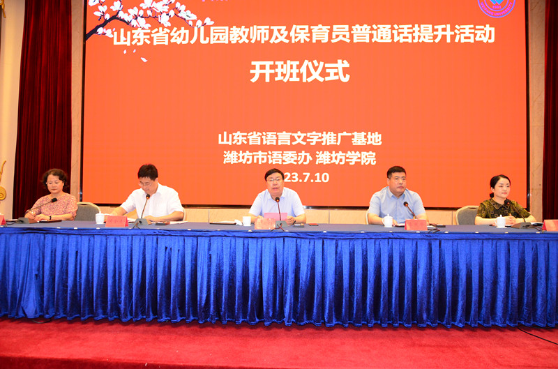本网讯 7月10日,2023年山东省潍坊市幼儿园教师及保育员普通话水平提升活动正式开班。学校党委委员、副校长王成端,潍坊市教育局总督学李庆华出席开班仪式并讲话。潍坊市语言文字工作委员会办公室、学校教务处相关人员、培训教师、学生助教志愿者、参训教师等近400人参加。教务处负责同志主持仪式。
