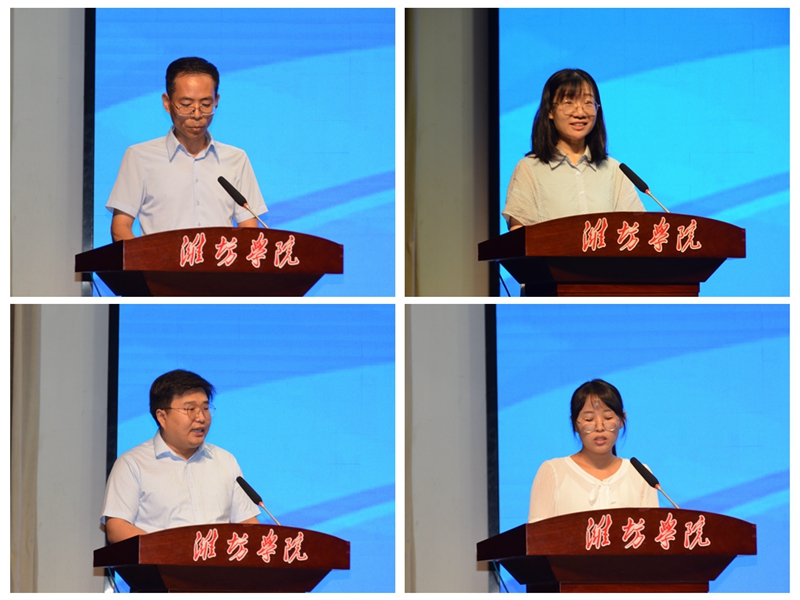 结业式上,外国语学院院长张学祥、物理与电子信息学院副院长张鲁筠、准聘教授代表天瑞磁悬浮产业学院董新峰、准聘副教授代表物理与电子信息学院李娟作交流发言。