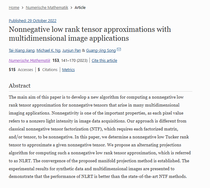 本网讯 近日,我校天瑞磁悬浮产业学院宋广景教授在计算数学领域国际顶级期刊Numerische Mathematik(德国数值数学)上发表了题为Nonnegative low rank tensor approximations with multidimensional image applications的研究论文,宋广景教授为唯一通讯作者。