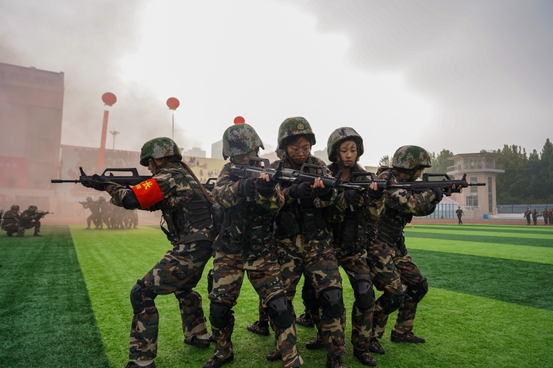 在国旗护卫方队的带领下,2023级新生军训方队迈着整齐的步伐,喊着嘹亮的口号,斗志昂扬地从主席台走过,接受与会领导的检阅。之后,他们进行了正规化养成、军体拳、战术综合演练等方队表演。