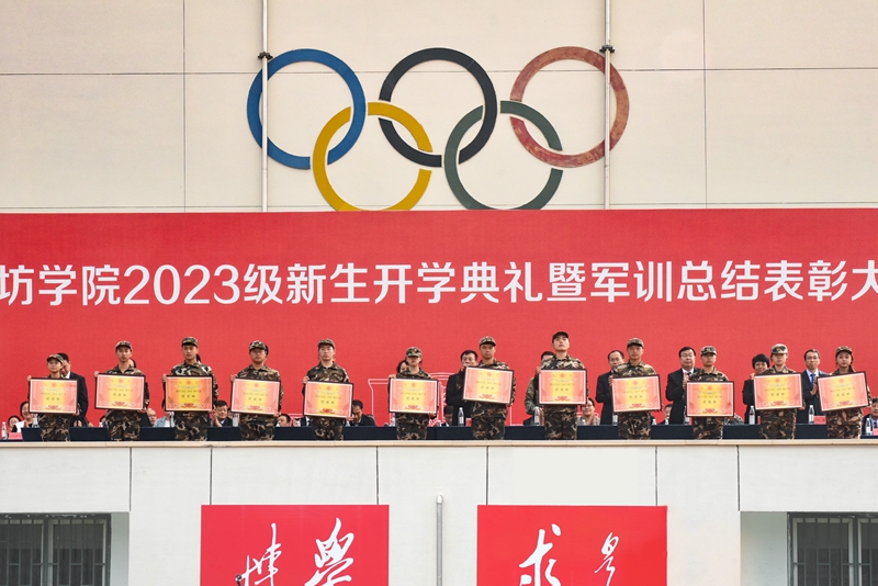 本网讯 金秋九月,硕果累累。9月28日,潍坊学院2023级新生开学典礼暨军训总结表彰大会在学校体育场举行。6868名2023级新同学完成军训的磨炼,开启大学新生活。
